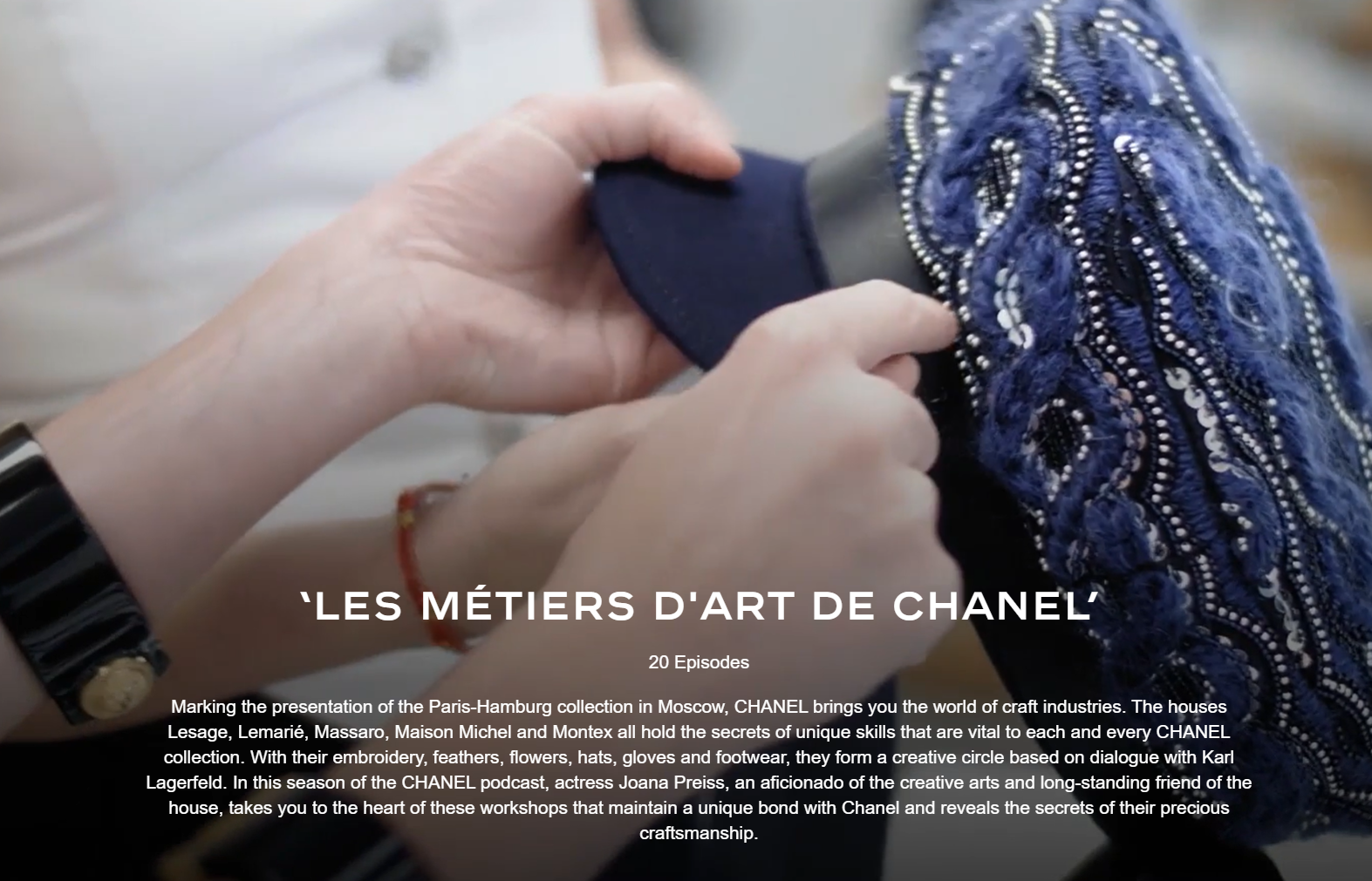 Les Métiers d’Art de CHANEL:這一系列聚焦品牌的製作工藝。由品牌摯友Joana Preiss 帶領聽眾走進Chanel 的高級手工坊,這些手工坊包括Lesage刺繡坊、Lemarié山茶花及羽飾坊、Massaro鞋履坊、Maison Michel 製帽坊與Montex刺繡坊等。