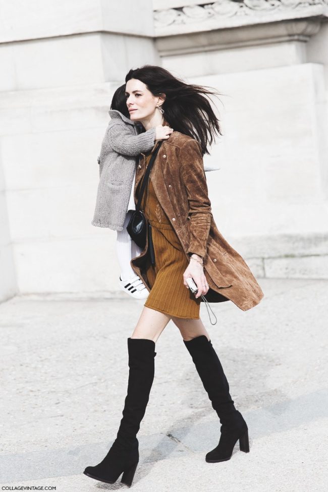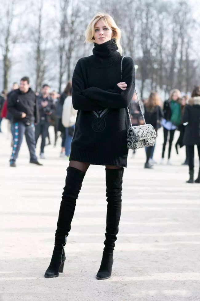 已過膝靴搭配洋裝時,千萬別忘了抓緊機會露出大腿的絕對領域,洋裝模糊了實際腿長,更能將整體視覺往上拉。