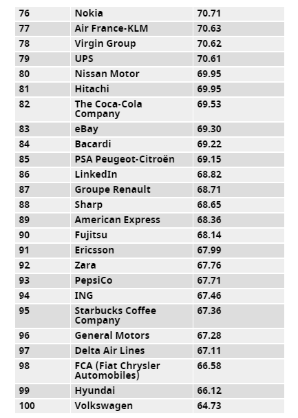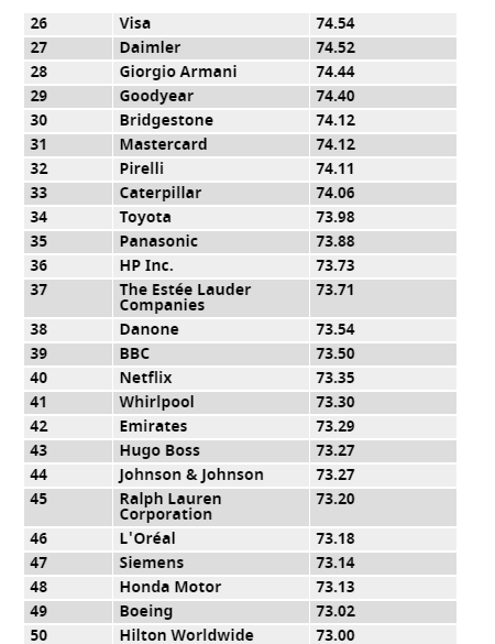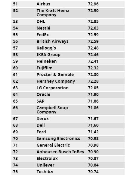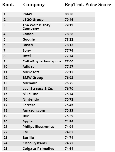 最終瑞士腕表品牌 ROLEX 以 80.38 的評分獨佔鰲頭,成為 2017 年全球最具聲譽企業,而 LEGO Group 和 Disney Company 則分別以 79.46 和 79.19 分排在第二、三名。運動品牌方面 adidas 衝進前十,高於排在第 15 位的競爭對手 Nike,而在 2016 年「全球最具價值品牌」排行榜中位列第一的 Apple,僅僅排在第 20 名。