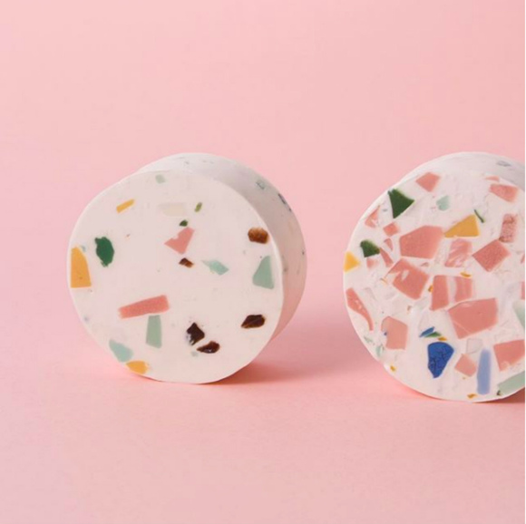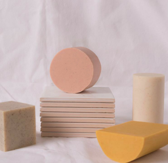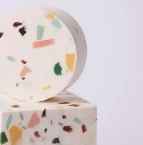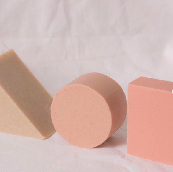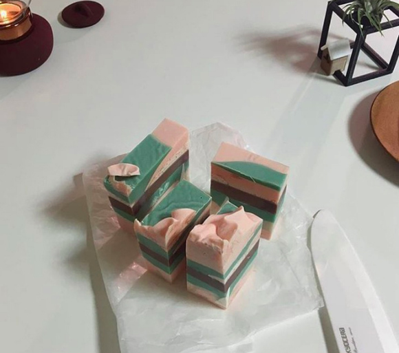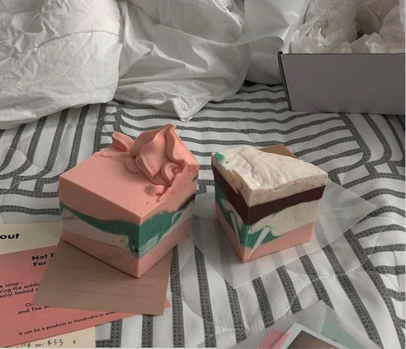 Hanahzo肥皂對奇奇怪怪的形狀很樂意嘗試,從基礎的正方體都到錐體,大概把高中數學課本裡關於立方體的全部模型都做了一遍。但Hanahzo對於色彩的要求很嚴格, 淺粉、淺綠、粉藍等配色無一不是按照網紅食物的配色標準,文青味十足,仿馬賽克的色塊點綴也能讓人聯想到食物——爆米花或者沙琪瑪。