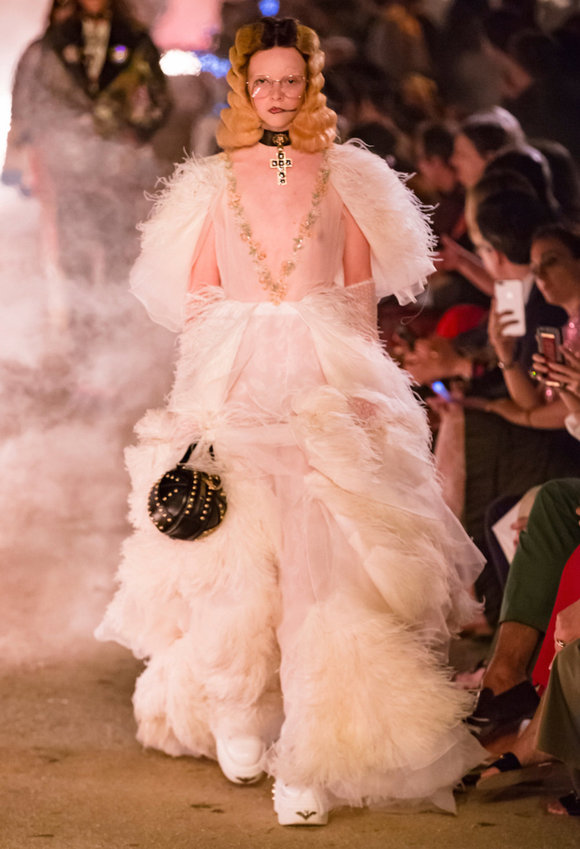 幾乎每一套造型都出現了象徵愛與救贖的十字架,但濃厚的宗教氛圍和設計元素並沒有影響Gucci一貫的張揚個性,從斑馬紋吊帶裝、龐克風裙裝到教皇式的披肩,令人目不暇給。