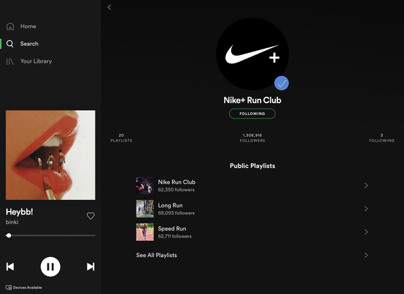 事實上,Nike在Spotify上註冊的官方帳號還有其他三個,分別是“NikeWomen”,“Nike+Training Club”和“Nike Football”。顧名思義,可以看到Nike針對不同的用戶群體做出了區隔,並創建了獨特的歌單。
