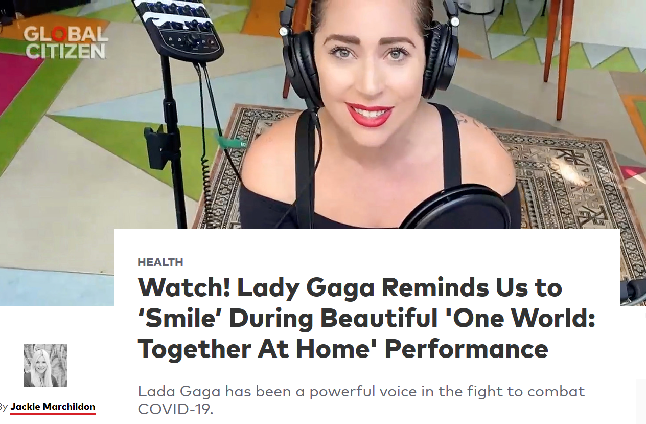 疫情來襲,由美國女歌手Lady Gaga策劃發起與世界衛生組織WTO聯合國際公益組織Global Citizen 於4月18日舉辦,一場連續8小時名為“ One World: Together At Home “的隔空演唱會刷爆全球各大社交網站。全球頂級明星響應抗疫義演,截至目前已籌集了近1.3億美元的善款。