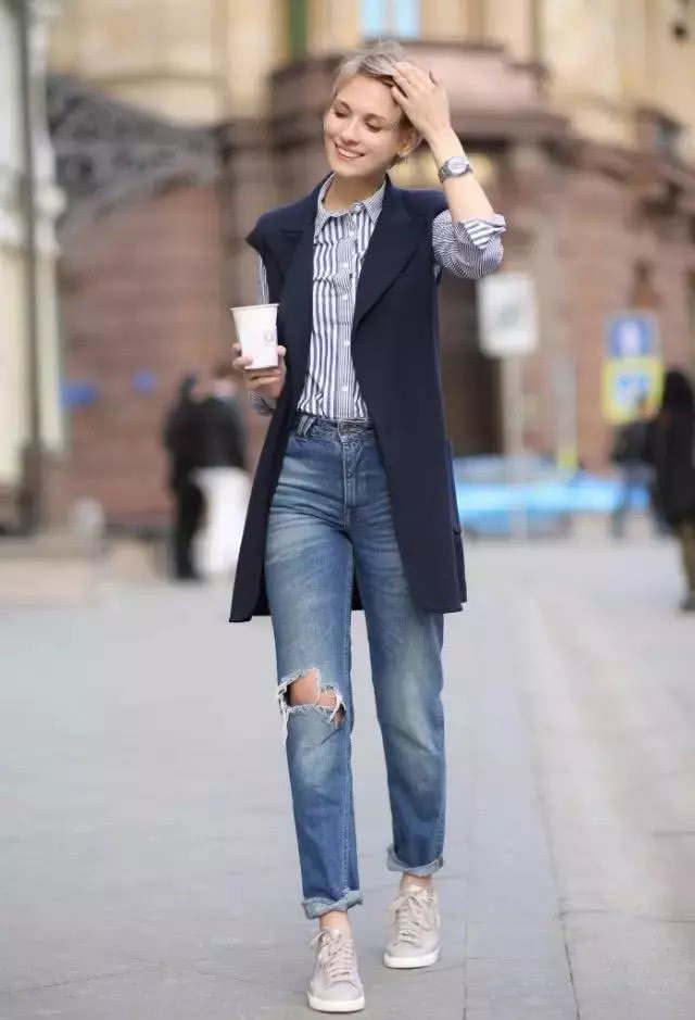 把今年很火的條紋襯衫作為內搭,時髦指數會更勝一籌。