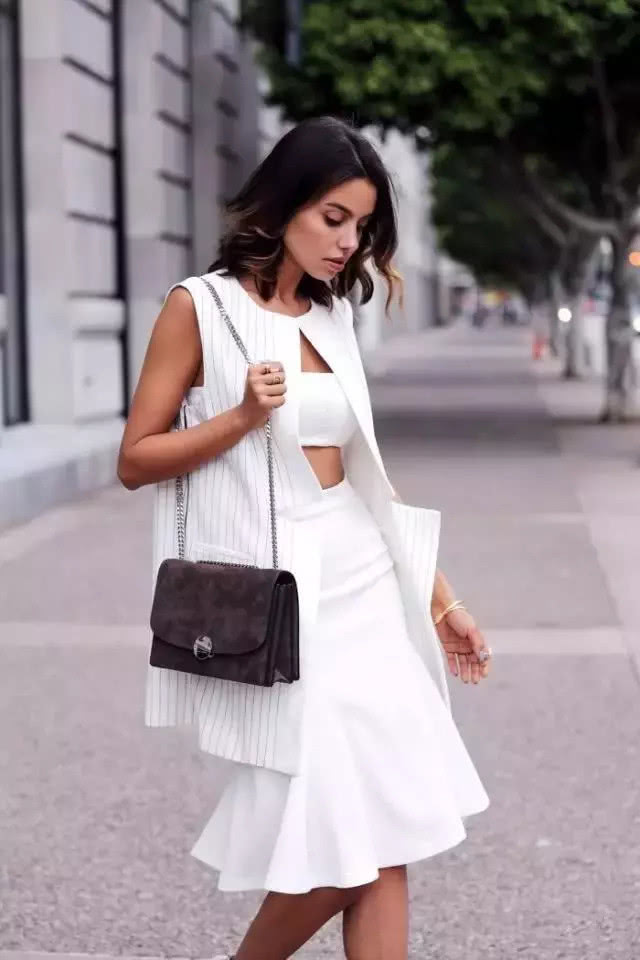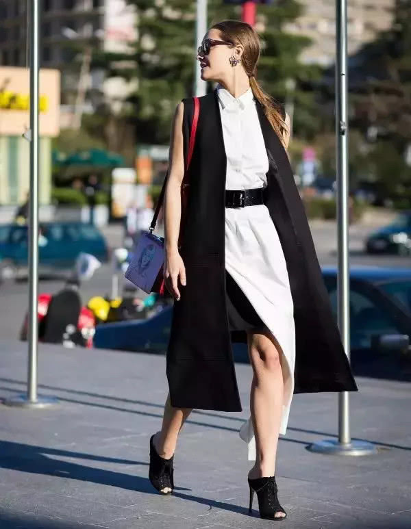 搭配裙裝也是街拍達人們喜愛的 look,長馬甲的幹練和裙裝搭配時,照樣能讓你女人味滿滿,氣質優雅又高貴。