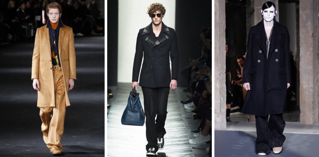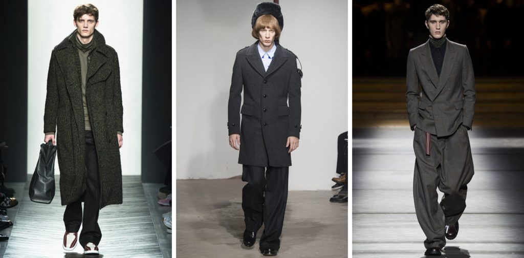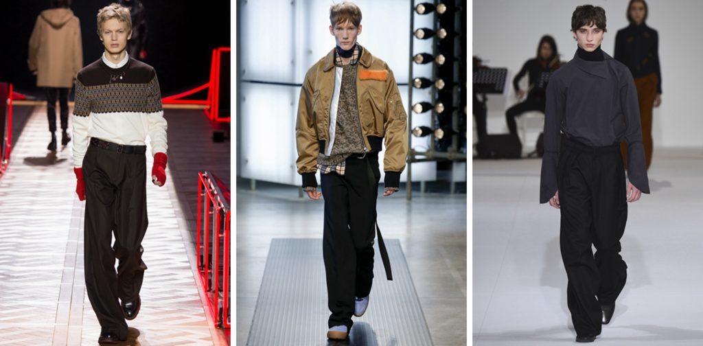 男裝的趨勢變化並不如女裝變化這麼大,所以這些流行的點到明年秋冬依舊適用。男士闊腿褲的選擇重點的在於材質,以牛仔、羊毛或純棉質地為佳。其次是剪裁,闊的概念在於褲腿大,但不是早期的垮,剪裁要硬挺。最後才是搭配,切忌與尖頭皮鞋組合,搭配簡單的球鞋是最時髦的選擇。