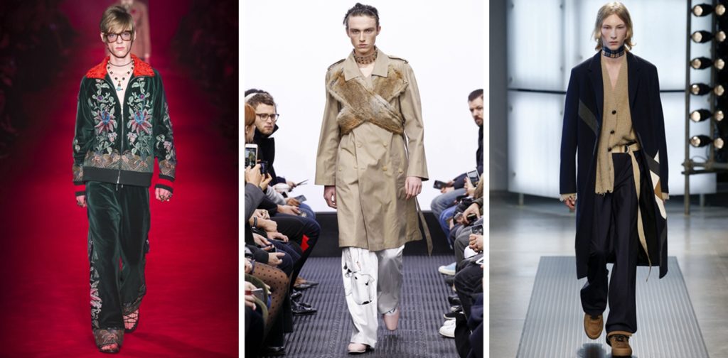當然,如果你想走在潮流尖端一點,不管他人眼光,只在乎夠不夠時尚的話,可以選擇設計感更強的闊腿褲。例如 J.W.Anderson 的刺繡款闊腿褲搭配皮草大衣,或者是 GUCCI 的絲絨刺繡睡衣款闊腿褲搭配同款刺繡夾克。這些搭配都會讓你潮到飛起,但也可能會娘到骨子裡。如何選擇,你自己看著辦吧。