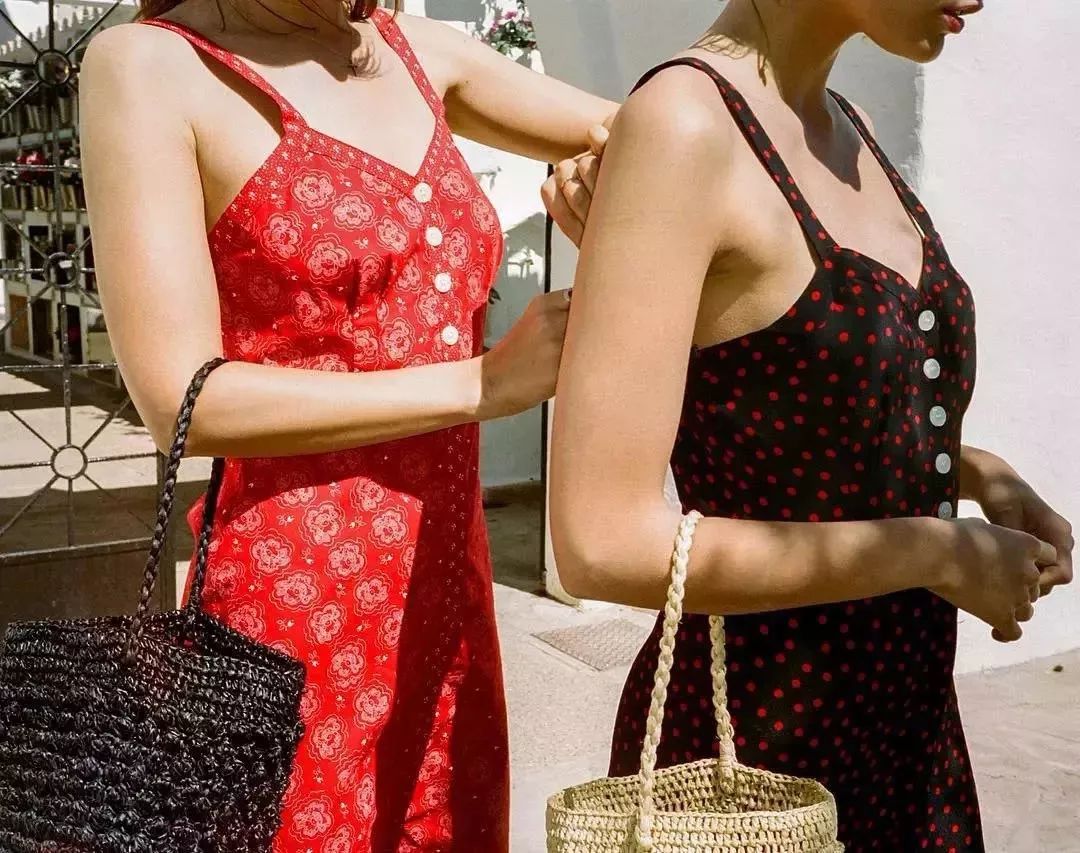 印花吊帶裙,白色的排扣既能起到點綴的效果,又不會顯得過於繁多凌亂!