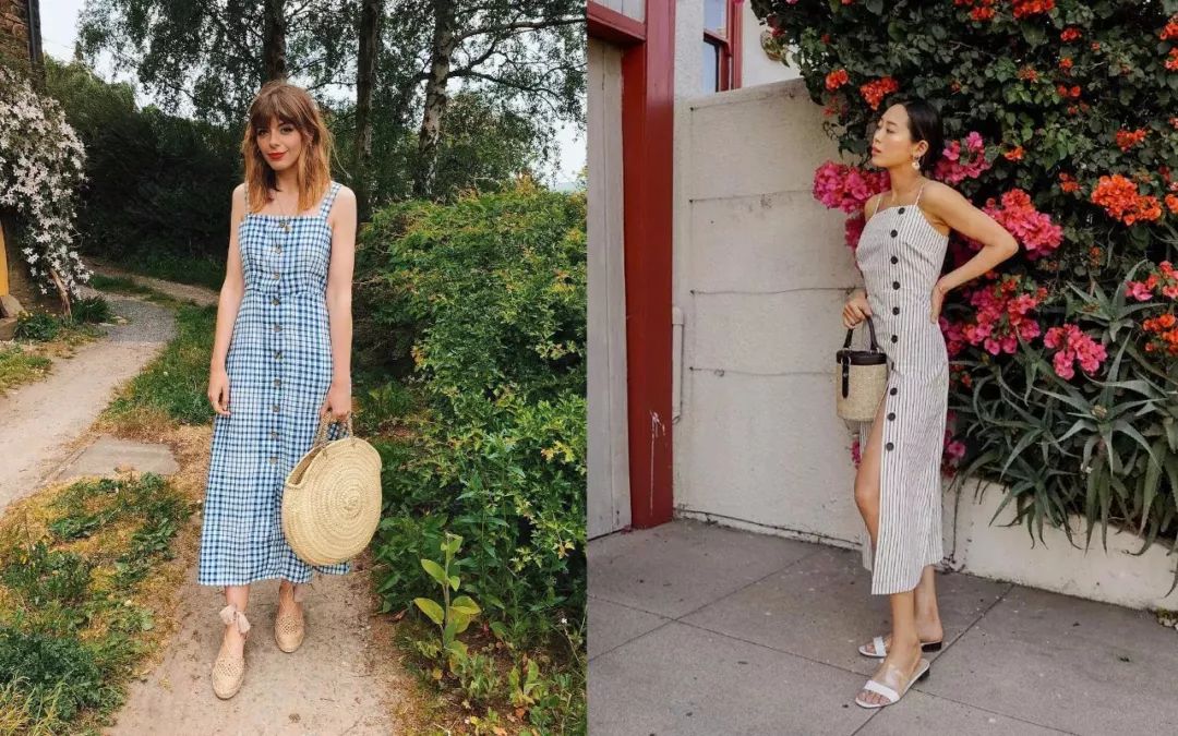 吊帶裙,增加排扣的設計後,讓你能夠演繹出不一樣的風格。