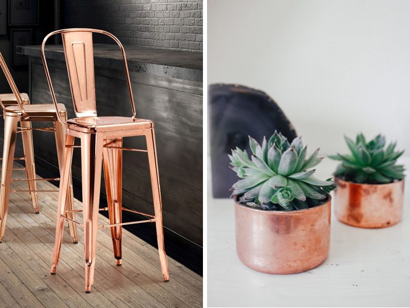 金屬材料方面,黃銅替代土豪金成為了 2017 最熱門的材質,在 Pinterest 上的熱度有將近翻倍的增長。黃銅容器是其中最受網友喜歡的產品,尤其是黃銅製作的迷你花盆,無論是單一材料製作的簡單款式,還是與其他材質組合的設計都很別致。除了花盆、桌椅、檯燈、收納籃子一類實用的產品,黃銅製作的裝飾品擺件也值得考慮。
