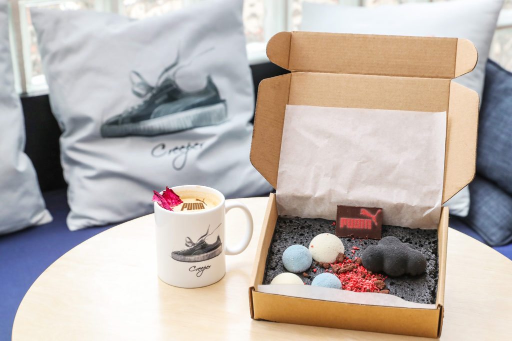 SNEAKER CAFE 店鋪內除了可以欣賞到 PUMA 的眾多產品展示之外,還可以想享受到 BLACKBIRD 為此次期間限定店鋪量身定制的 PUMA SNEAKER 下午茶套餐:B.O.G In The Box 套餐和 Basket Heart In The Box 套餐。顧名思義,這兩個套餐分別以今年的新款 B.O.G Sock與 Basket Heart 為靈感製成。