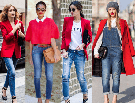 說過好多次的藍色的最佳替換就是百搭的牛仔,作為最簡單的替換,用牛仔藍搭配大紅毫無難度。