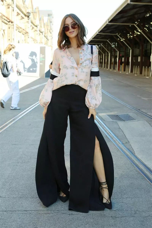 類似的開衩褲搭配同款材質的雪紡襯衫,再加入一些荷葉邊的設計,清涼又舒適。