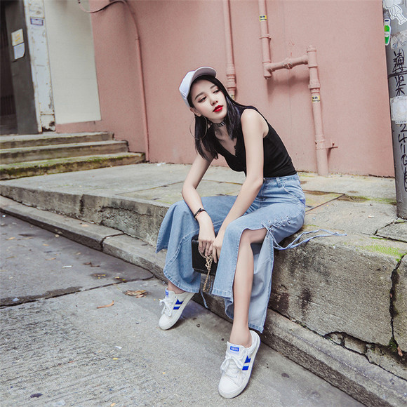 必不可少的牛仔布料同樣適用於開衩褲。比如說張驪這條斜開衩的牛仔褲,即使搭配拖鞋也十分減齡。不過,相對於普通的側開衩和前開衩來說,這種設計往往對腿型有更嚴格的限制。