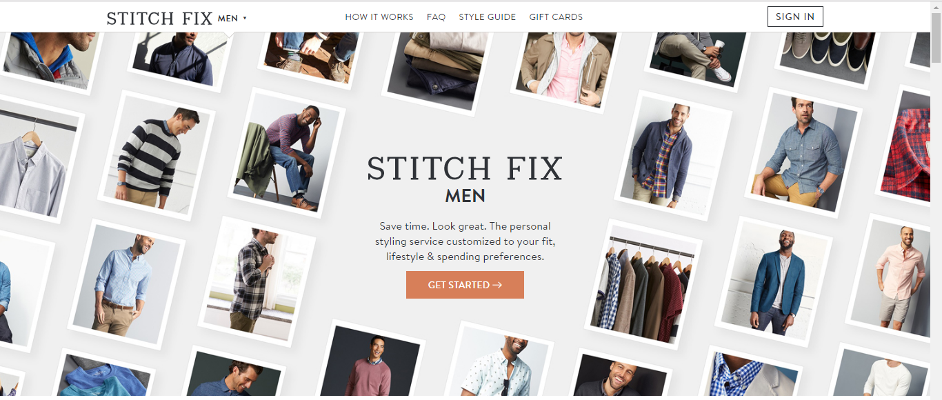 Stitch Fix 的商業模式是在賣一種『猜你會喜歡』期待的心情。當你提交基礎資料後,Stitch Fix 會結合造型師的建議,給你郵寄混合了不同品牌的訂購盒子。收到打開後若你滿意,便以直扣價買下,若不滿意可直接退回。Stitch Fix在經營了女裝生意 6 年之後,去年還引入了男裝和大碼女裝,現在共有 450 個品牌。