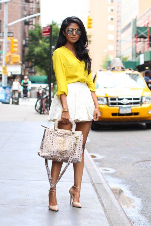 黃白搭配的鞋包,用白色、裸色、棕色是最好的。