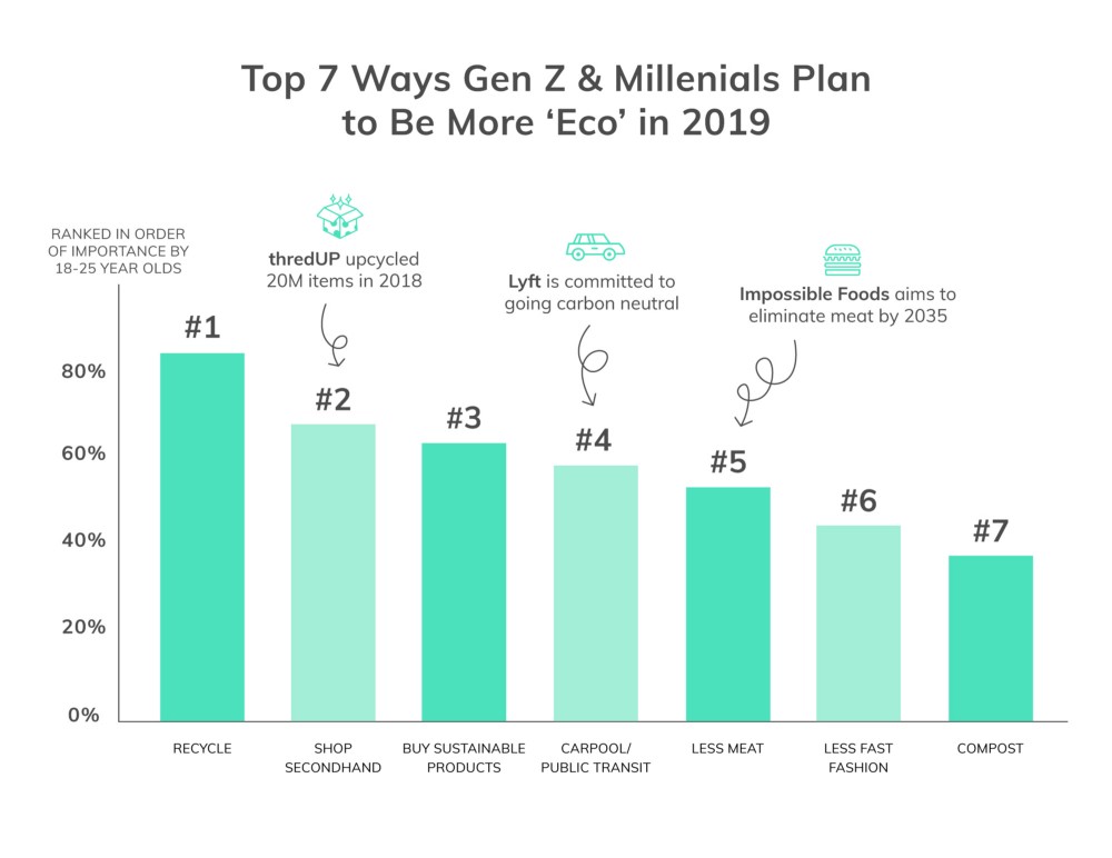 2019年,千禧代和 Z 世代消費者的7大環保關鍵詞分別為:回收利用、購買二手商品、購買環保商品、乘坐公共交通工具、減少肉類攝入量、減少購買快時尚商品次數和生物堆肥。