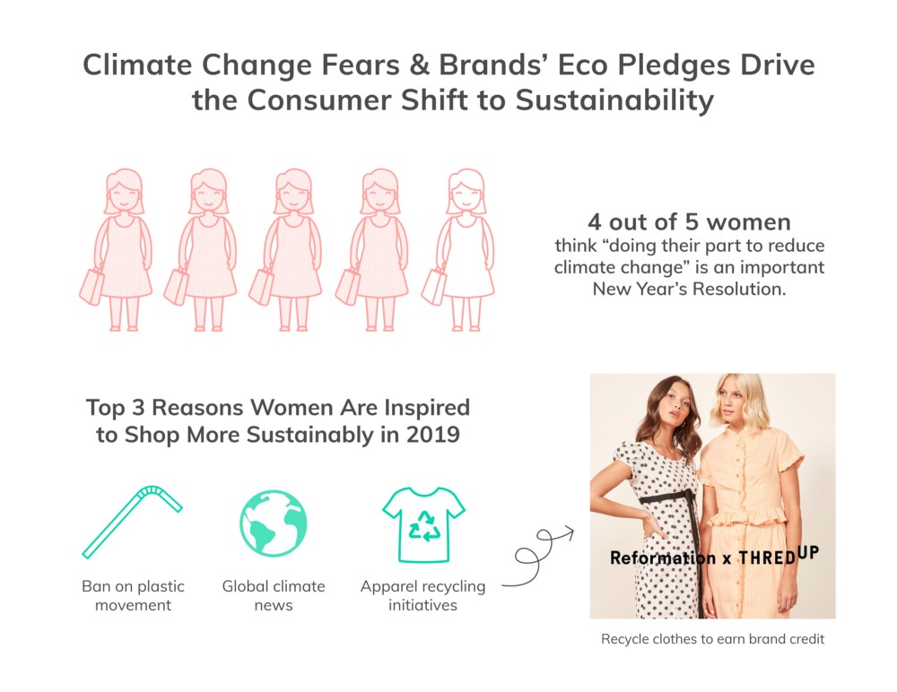 美國時尚轉售網站 ThredUp 發佈了2019年消費者購物展望報告(New Year Resolution Report)。通過對1000餘名女性消費者進行調查,他們發現,消費者對可持續發展的重視程度有所提高,而由年輕消費者主導,減少快時尚品牌消費的零廢棄時尚潮流也有擴大的趨勢。