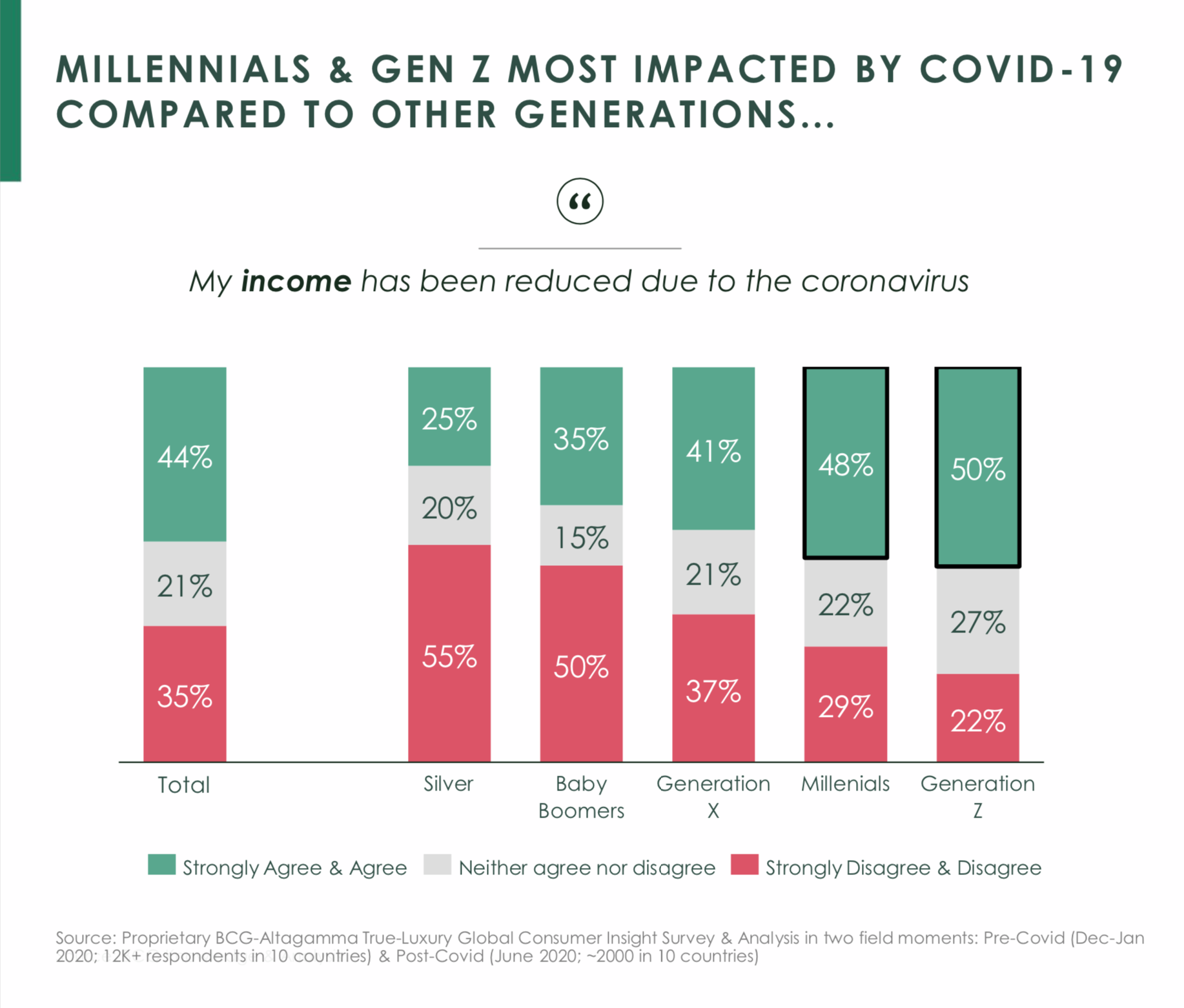 報告指出,50%的Z世代和48%的千禧一代表示收入嚴重受到疫情影響,這一比例高於前幾代人。