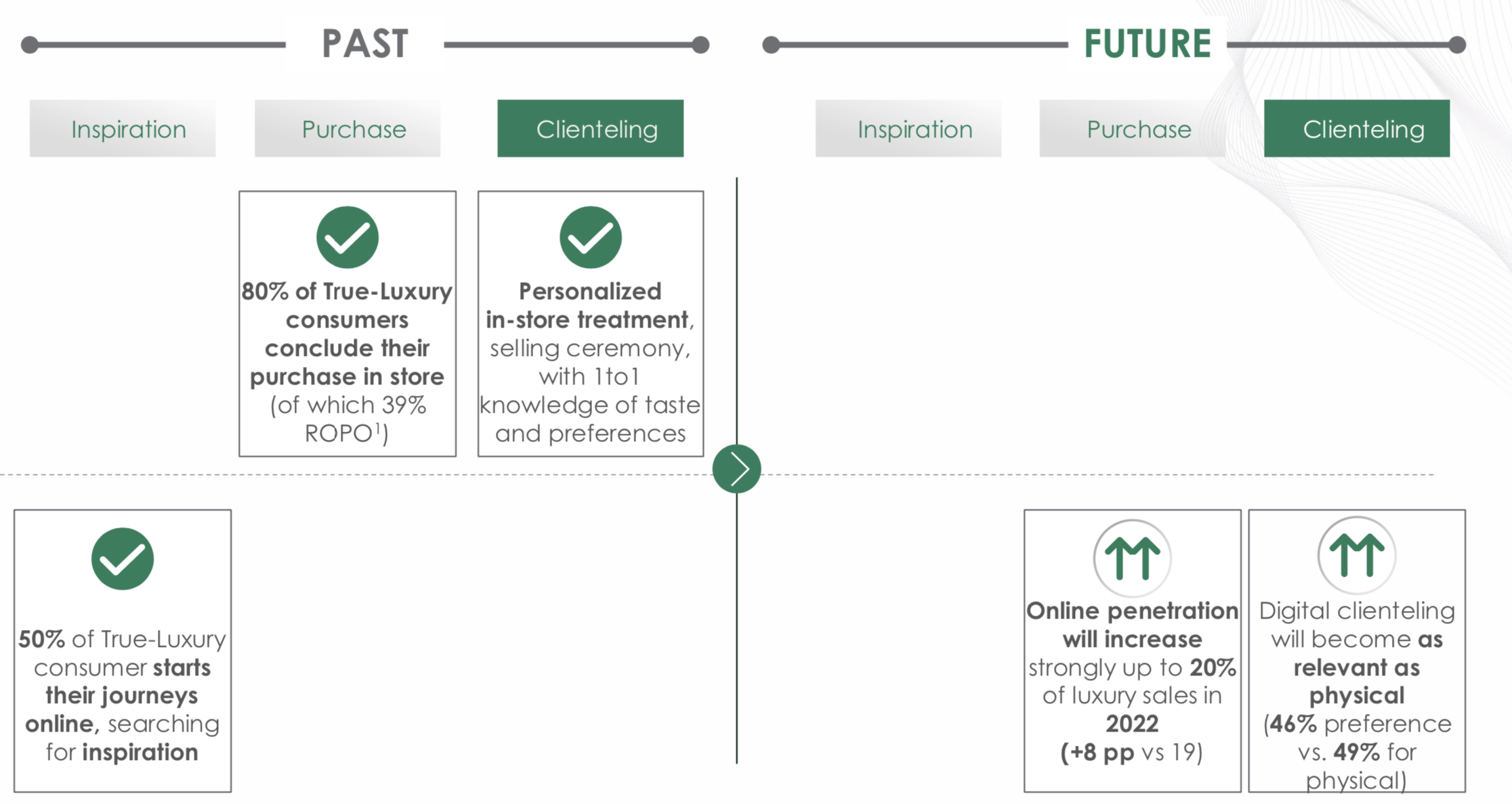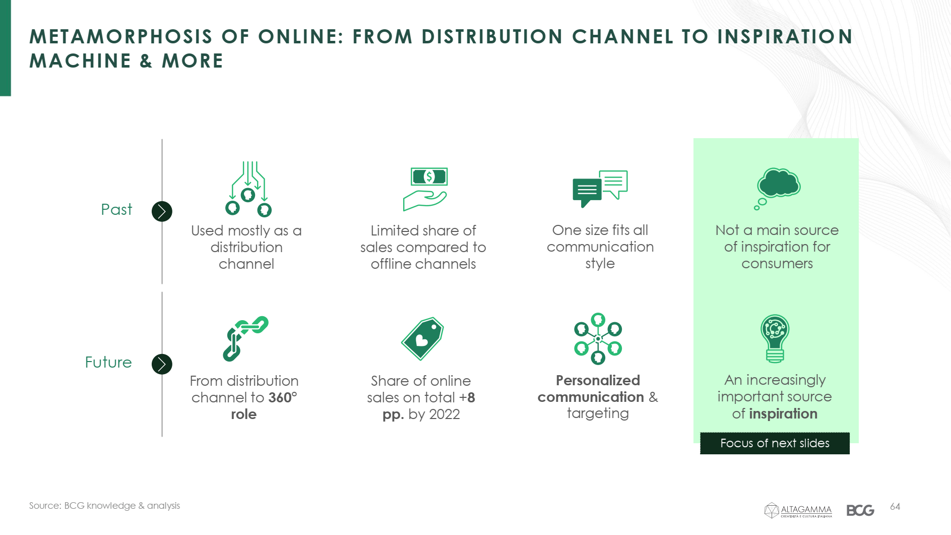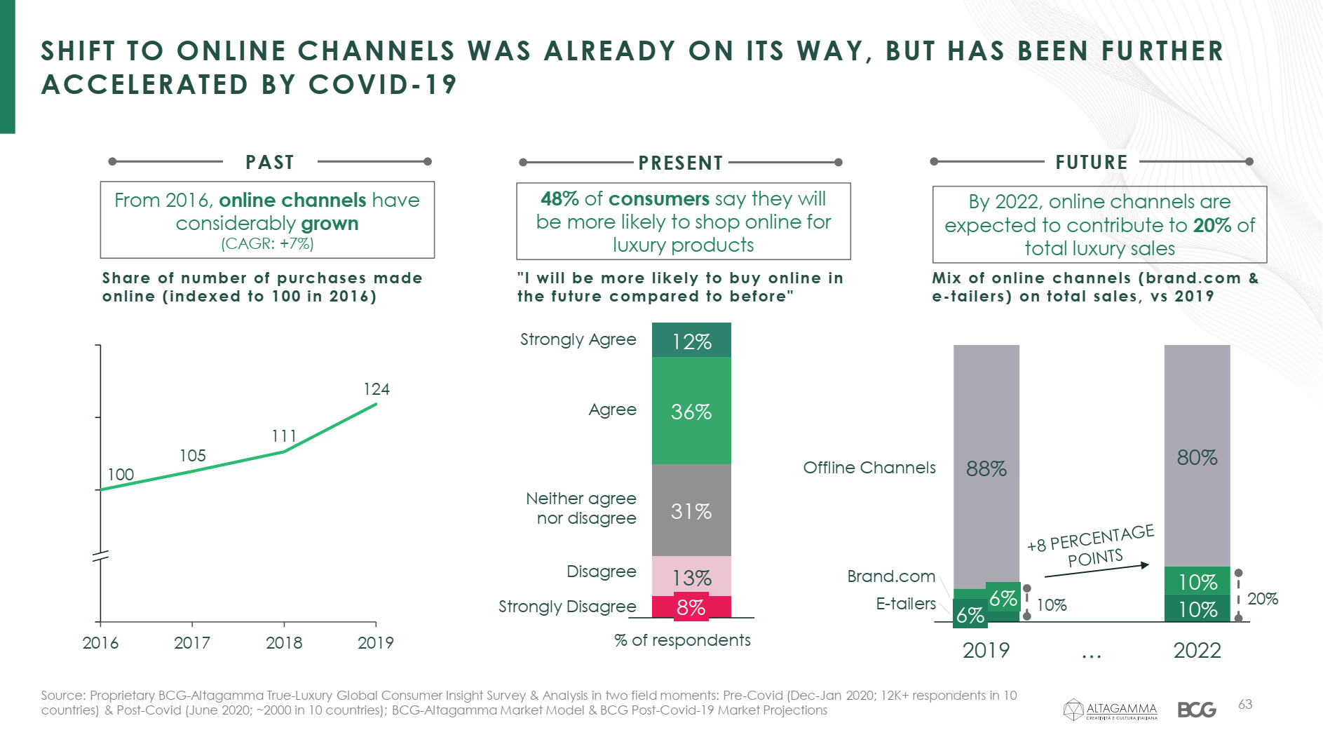 報告指出,2016~2019年,線上奢侈品銷售額年度複合增長率為7%。目前48%的受訪者表示他們會更傾向於線上購買奢侈品,BCG預計,到2022年,線上渠道銷售額佔比將會從2019年的12%上升至20%