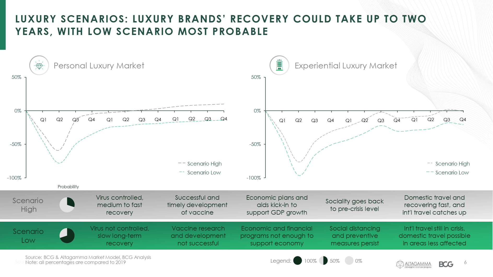 綜合疫情控制、公共衛生髮展、經濟刺激政策、社交距離、國內外旅行限制等多方面因素,BCG對2020年全球奢侈品市場(相對於2019年)的可能表現給出了“快速恢復”與“緩慢恢復”兩檔前景預測,並指出“緩慢恢復”是目前最可能的情況,在這個預測下,奢侈品需要2~3年的時間恢復至疫情前水平。
