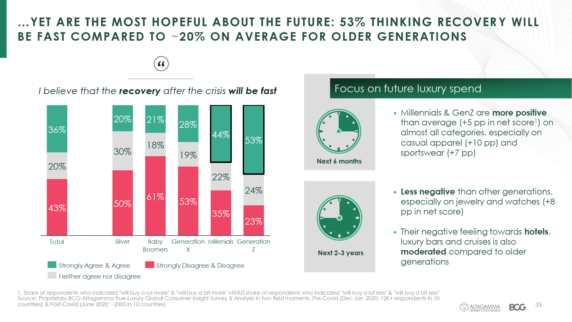 雖然在疫情中遭受最嚴重的打擊,但千禧一代和Z世代是對奢侈品市場恢復最有信心。53%的Z世代和44%的千禧一代堅定認為奢侈品市場會迅速恢復,比例遠高於高於X一代(26%),嬰兒潮一代(21%)、銀髮族一代(20%)等前幾代人。