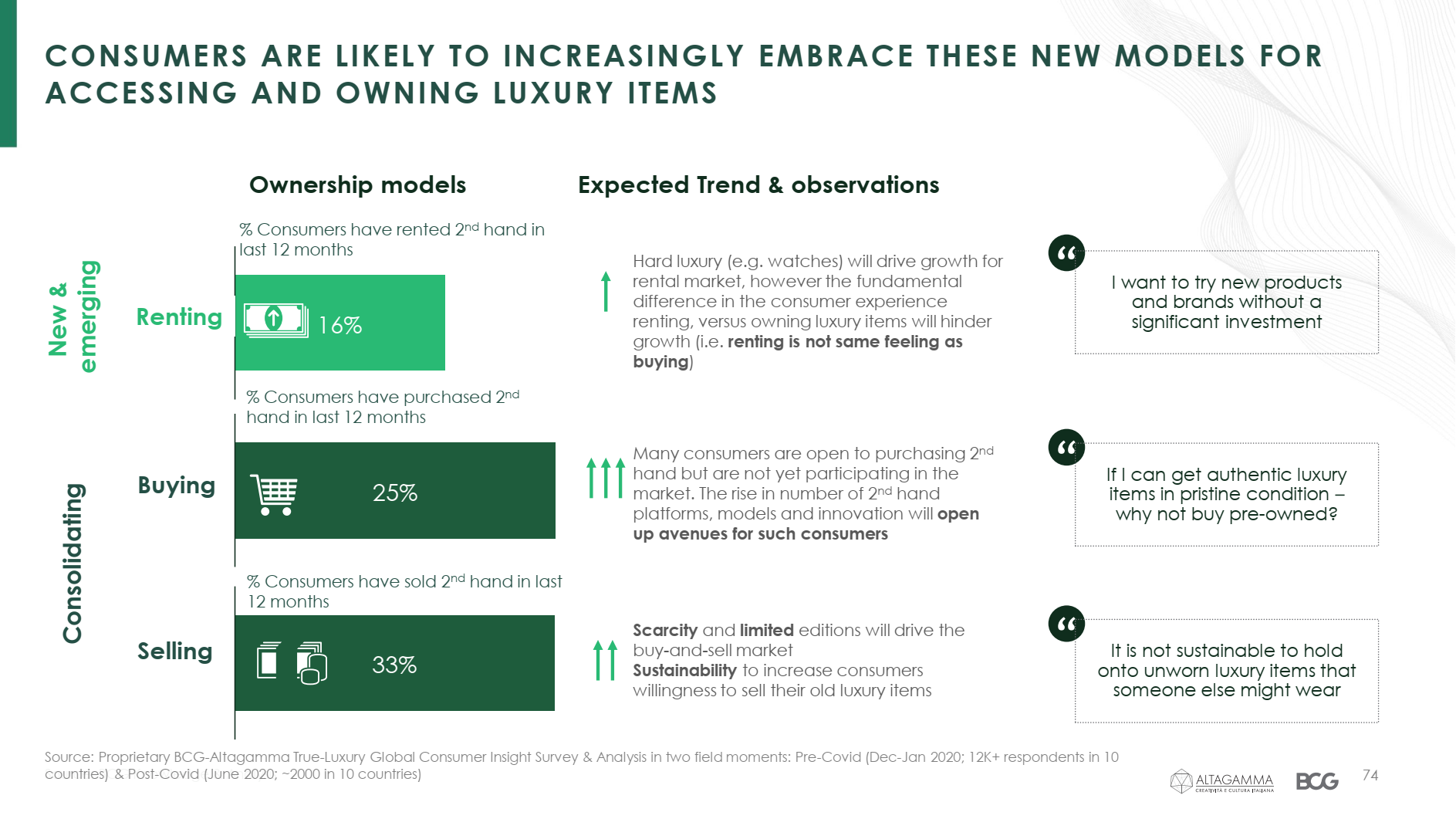 BCG報告顯示,二手和租賃市場正在崛起,16%的受訪者表示在過去一年租賃過奢侈品,25%的受訪者表示在過去一年購買過二手奢侈品,33%的受訪者表示在過去一年出售過二手奢侈品。相較而言,購買二手奢侈品比租賃更受歡迎,62%的受訪者表示對購買二手奢侈品有興趣,而租賃這一比例為45%。