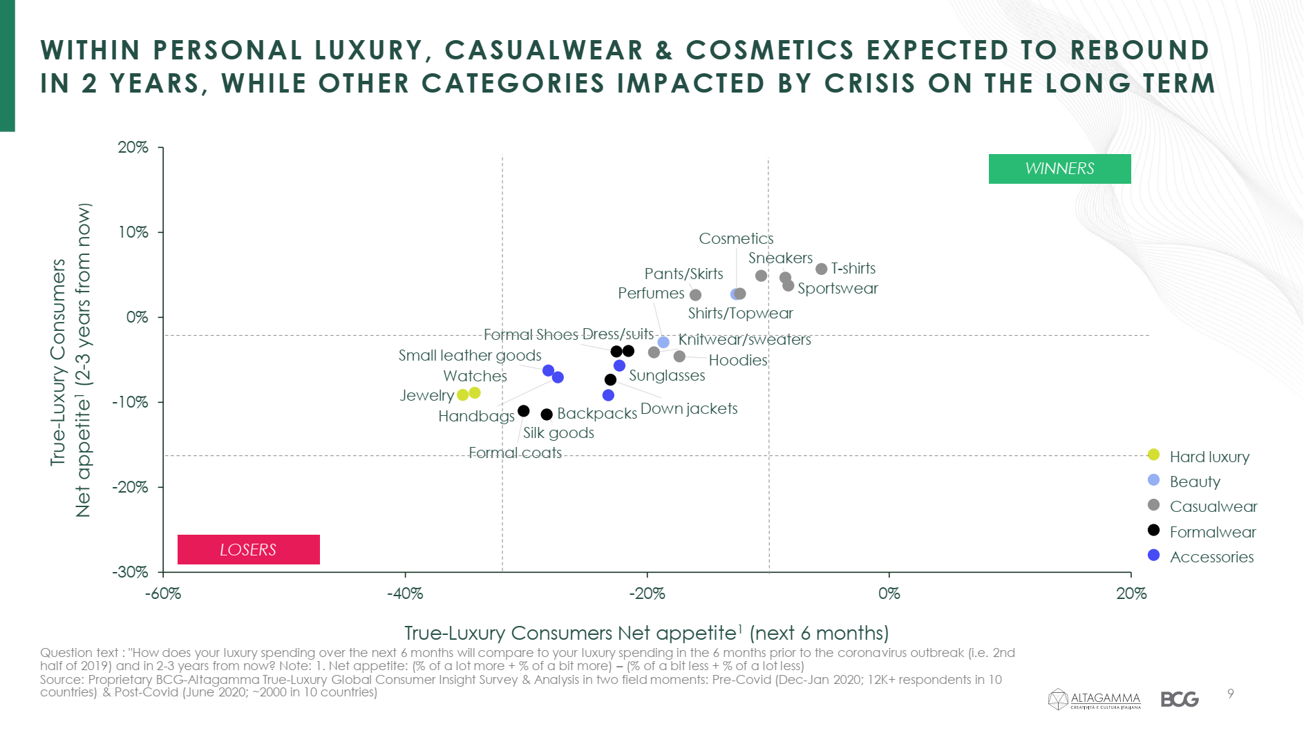就品類而言,在個人購物奢侈品中,休閒服裝和化妝品牌預計需要兩年恢復至正常狀態,鐘錶珠寶、皮具等可能需要更長時間恢復。