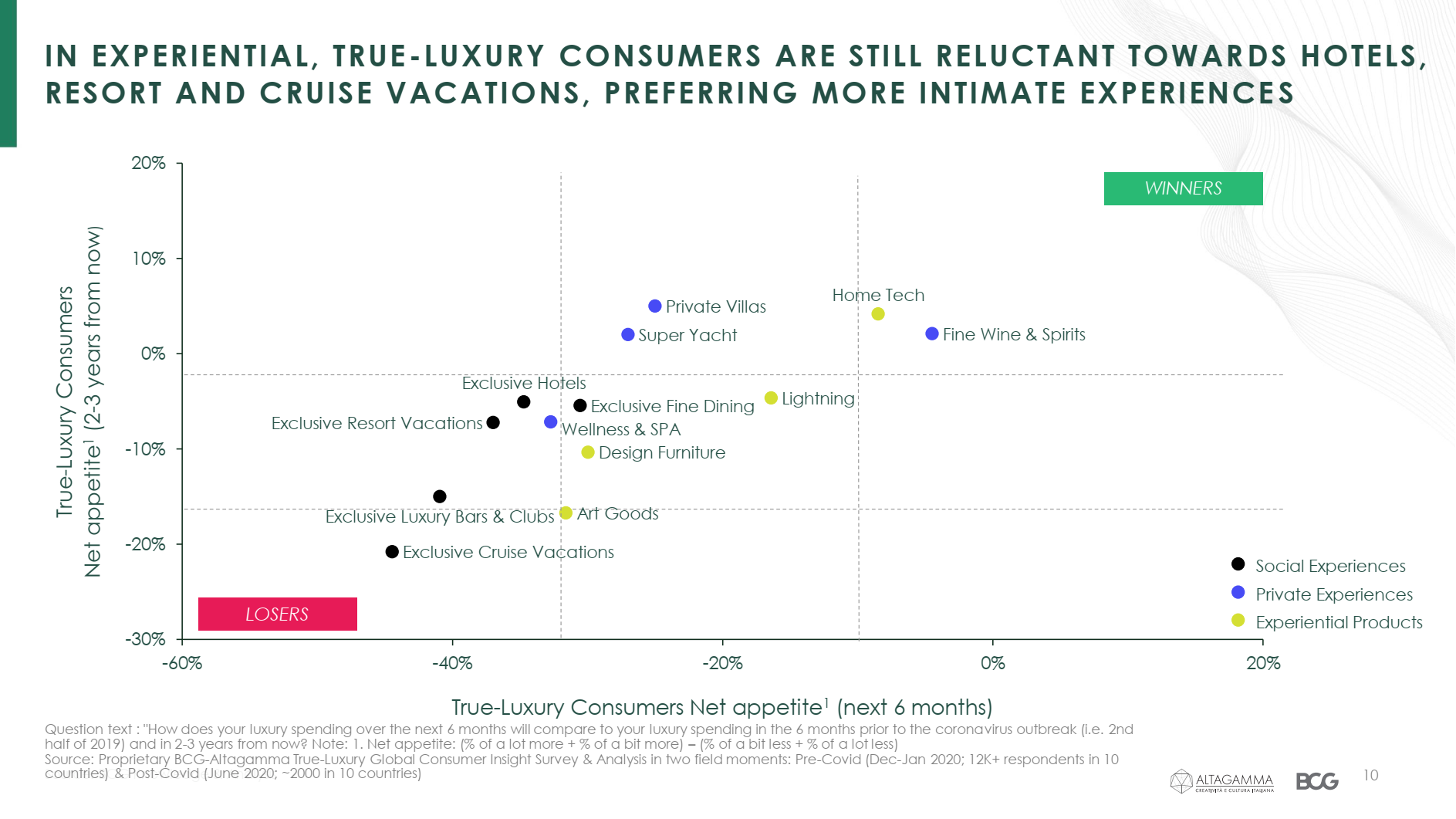 在體驗式奢侈購物中,精釀啤酒、智能家居等偏私人體驗的品類將會最快恢復,高檔酒店、遊輪度假等需要更長時間。