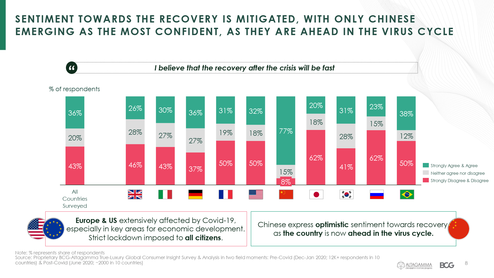 一項數據表明,中國消費者對於疫情后奢侈品市場迅速恢復持有最大信心,77%的比例遠超其他國家。