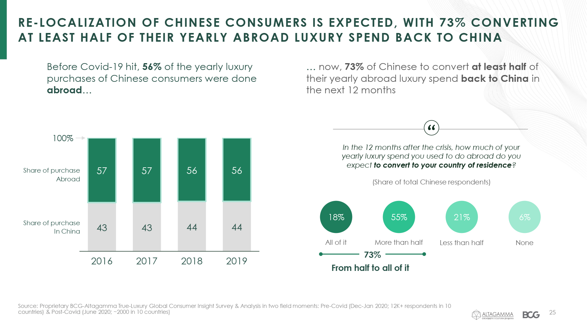 在新冠疫情爆發前,中國奢侈品消費56%在海外發生,疫情后,73%的受訪者表示未來一年內會將此前在海外消費的至少一半放在國內進行。